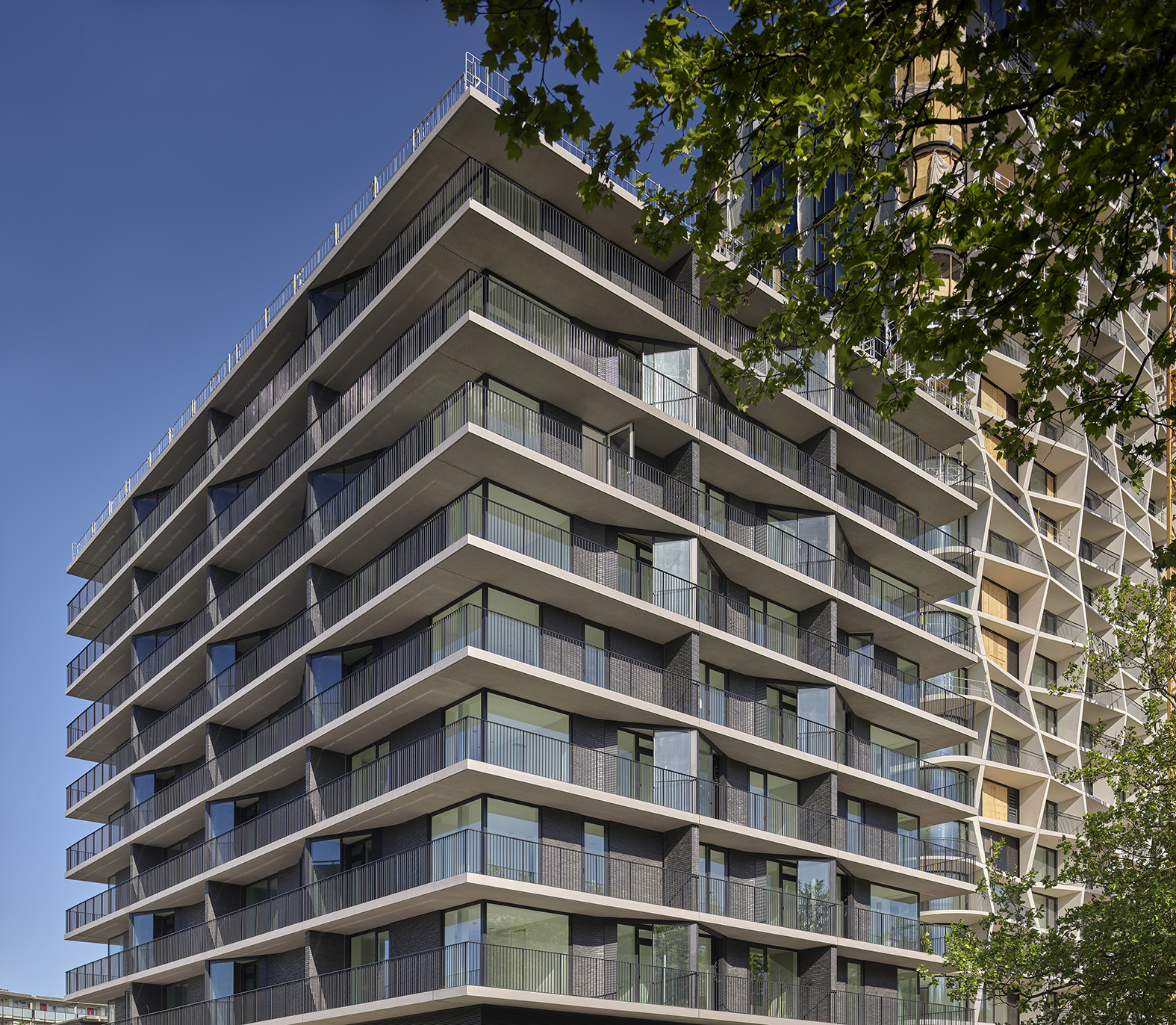 Van de twee residentiële krachtpatsers is Quartz de opvallendste verschijning. De 75 meter hoge woontoren torent boven de omringende bebouwing, elegante bomenrijen en het naastgelegen park uit. De sierlijke stapeling van 23 woonlagen in combinatie met uitspringende balkons en de afgeronde vormentaal is een organisch ogend stukje bouwkunst.
